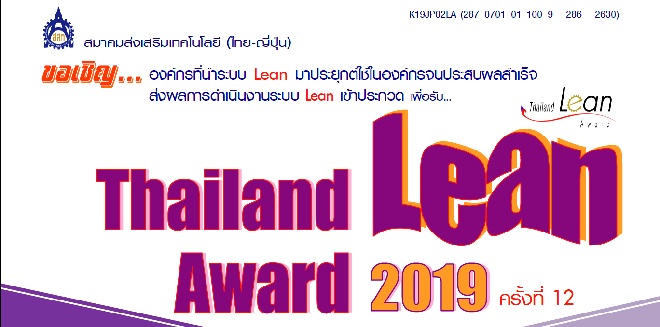 สมาคมส่งเสริมเทคโนโลยี (ไทย-ญี่ปุ่น) จึงขอเชิญองค์กรที่นาระบบ Lean มาประยุกต์ใช้ในองค์กรจนประสบผลสาเร็จ ส่งผลการดาเนินงานระบบ Lean เข้าร่วมประกวด Thailand Lean Award 2018 โดยท่านสามารถดูรายละเอียดและดาวน์โหลดแบบฟอร์มการสมัครได้ที่นี่ Thailand Lean Award 2018